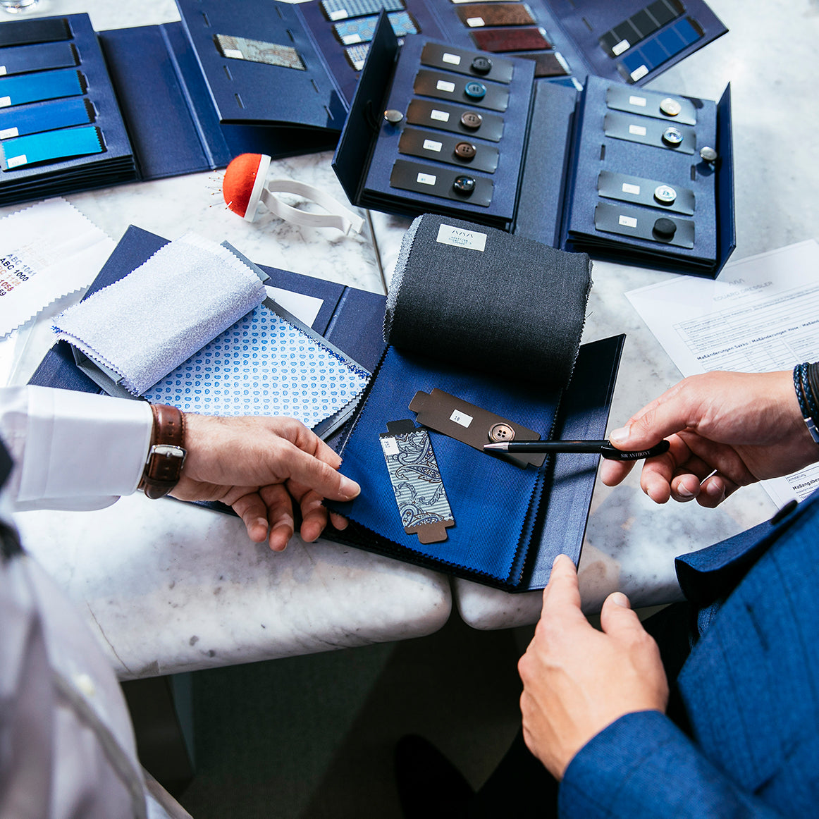 Choose from premium fabrics and discuss design details. Your unique suit begins to take shape, tailored to your preferences.